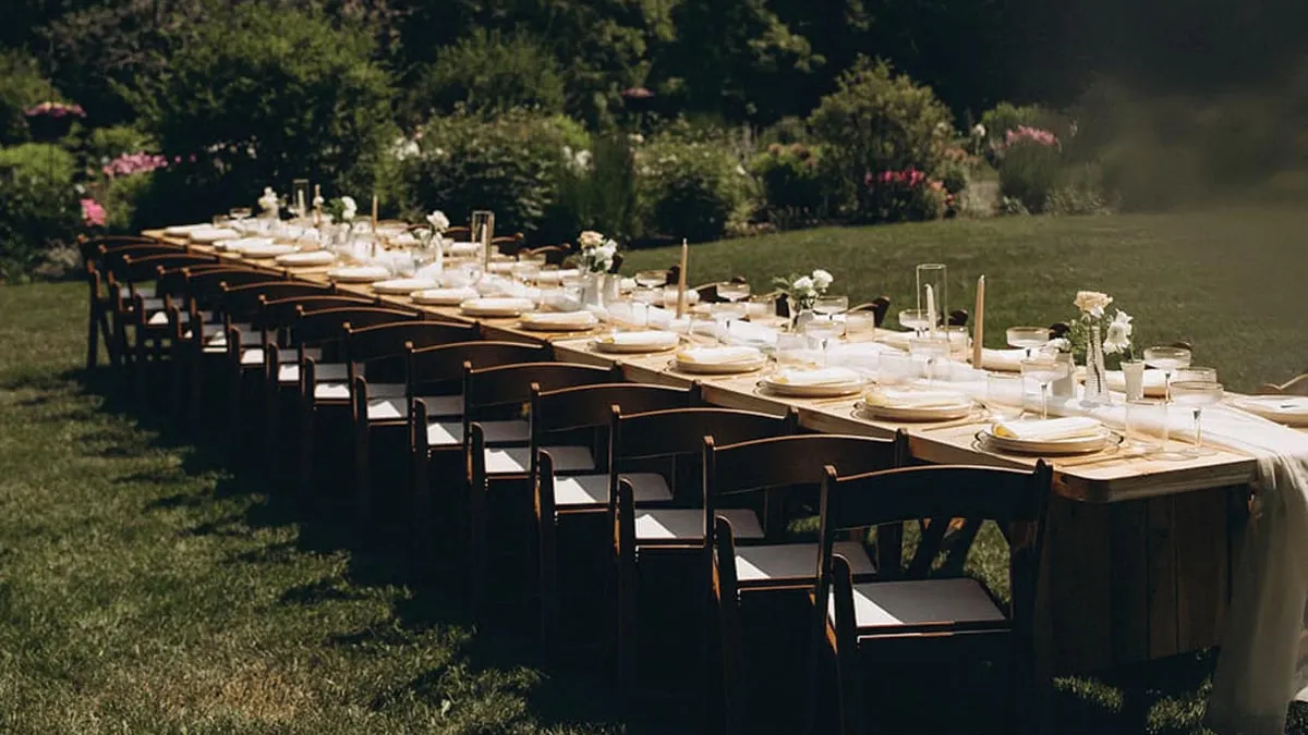 - Charme rustique : Parfait pour des lieux en plein air ou des granges, ce style inclut des tables en bois, des chemins de table en toile de jute, et des centres de table dans des bocaux Mason. Les guirlandes lumineuses créent une ambiance chaleureuse et accueillante.